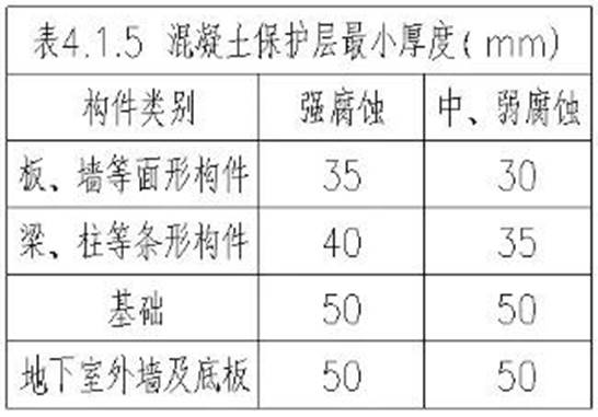 5)在腐蝕環境下,全部鋼筋(縱筋、箍筋、分布筋等)的混凝土保護層最小厚度,應符合表4.1.5的規定。