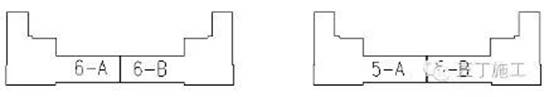 根據設計后澆帶及伸縮縫的設置,將地下室墻柱及頂板梁劃分為4個區域分別進行混凝土的澆筑及試塊的留置,4個區域包括5-A、5-B、6-A、6-B,如下圖所示: