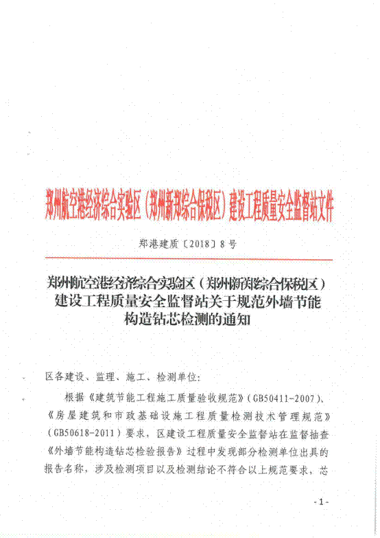 鄭州航空港經濟綜合實驗區(鄭州新鄭綜合保稅區)建設工程質量安全監督站關于規范外墻節能構造鉆芯檢測的通知