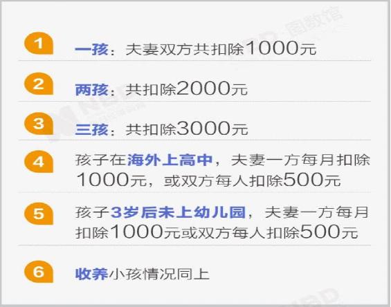 子女從滿3周歲至教育結(jié)束,不論處在什么教育階段,不論是在中國境內(nèi)還是境外接受教育,均可按照每個子女/月扣除1000元,或由夫妻雙方每人各扣除500元計算。