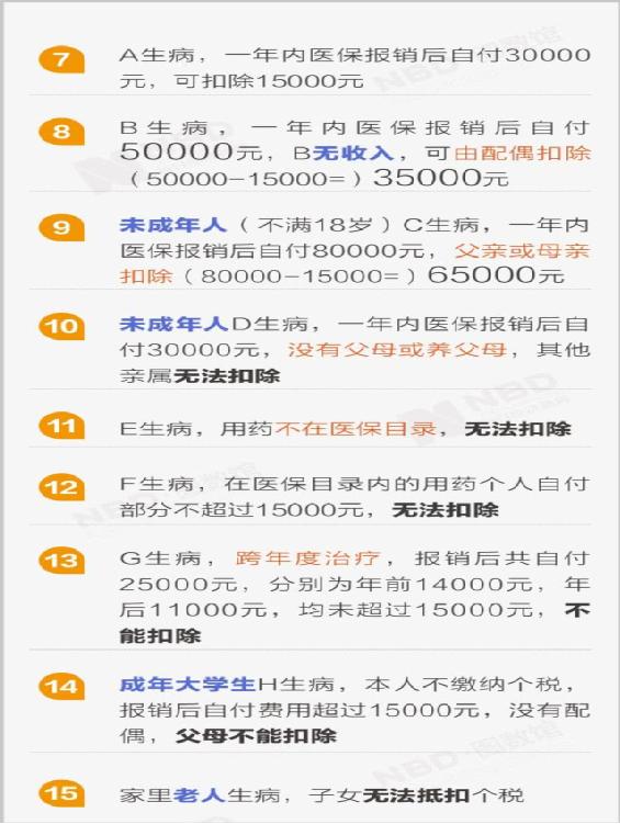 在一個納稅年度,納稅人醫(yī)保報銷后個人負(fù)擔(dān)(醫(yī)保目錄的自付部分)累計超過15000元的部分,在80000元限額內(nèi)據(jù)實扣除。