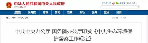 近日,中共中央辦公廳、國務院辦公廳印發的《中央生態環境保護督察工作規定》。
