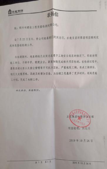 11月15日,我公司樁基部來(lái)自亞星環(huán)翠居項(xiàng)目的表?yè)P(yáng)信,信中對(duì)樁基部門(mén)的孫大勇、郭鎮(zhèn)山、皇甫剛領(lǐng)、劉哲、張彥濤、劉開(kāi)發(fā)等幾位同志,進(jìn)行了熱情表?yè)P(yáng),對(duì)幾位同事在參檢亞星環(huán)翠居項(xiàng)目,積極配合建設(shè)單位和施工單位的態(tài)度表示感謝。