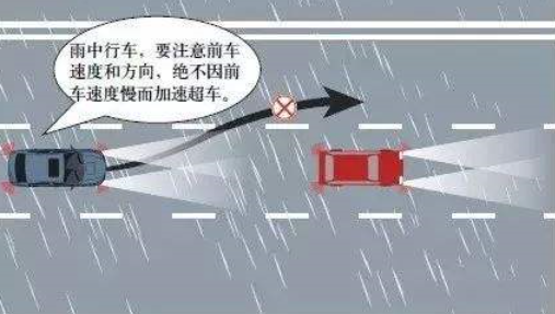 雨天視線受阻,一定要隨時注意前車的行駛速度和方向,絕不可因前車速度慢而加速超車。雨天輪胎與地面的摩擦力大大減小,如果加速超車的話,很容易造成輪胎側滑,造成交通事故。