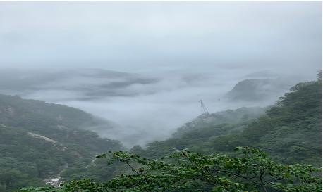 此次旅程一開始就充滿了緊張刺激,蜿蜒的山路盤旋而上,坐在上山的大巴車上宛如坐過山車。一路上群山環繞,既是“蒨首見龍游,群山翠浪流”,也是冷疊群山闊,清涵萬象殊。