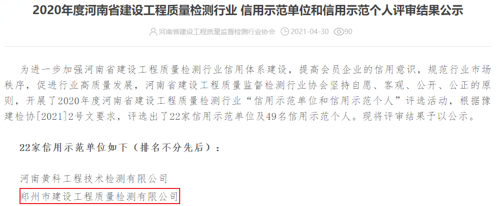 喜訊!我司榮獲2020年河南省建設(shè)工程質(zhì)量檢測行業(yè)信用示范單位