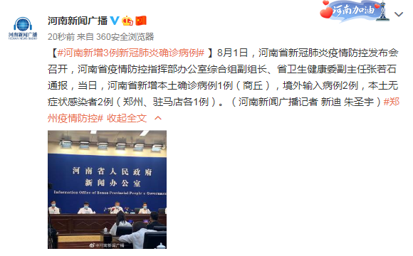 河南發(fā)布會(huì):新增本土確診病例1例(商丘),本土無(wú)癥狀感染者2例(鄭州、駐馬店各1例)