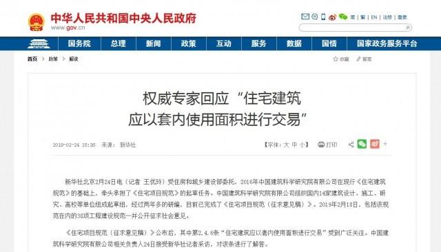 2019年的2月24日,新華社發布《權威專家回應“住宅建筑應以套內使用面積進行交易”》的文章,文中援引中國建筑科學研究院有限公司相關負責人的解釋稱:“住宅建筑應以套內使用面積進行交易”這一條款的提出,在規范起草過程中,對國際國內住宅面積計算做法進行調研,按套內使用面積計算是國際通行做法,而我國住宅面積計算方式主要采用建筑面積或套內建筑面積。